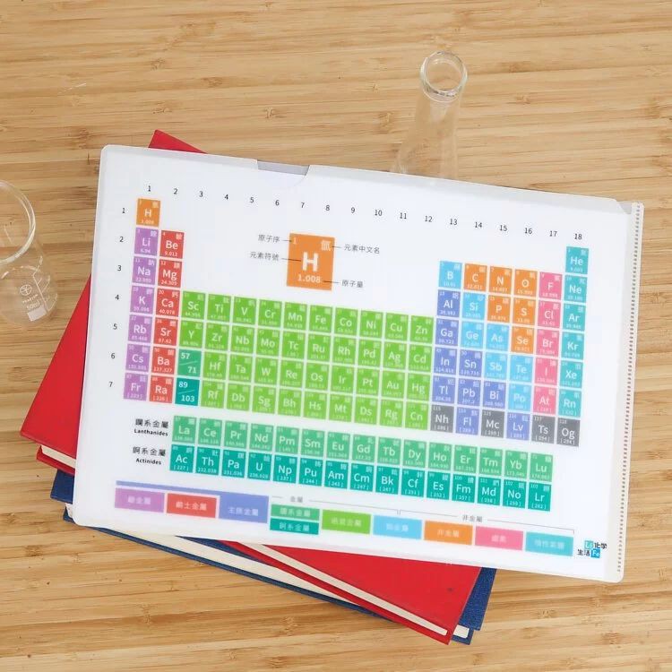 以最新版元素週期表為設計的資料夾,輕盈好帶, 厚磅質感保護文件,放在包包裡不易摺到或壓到。