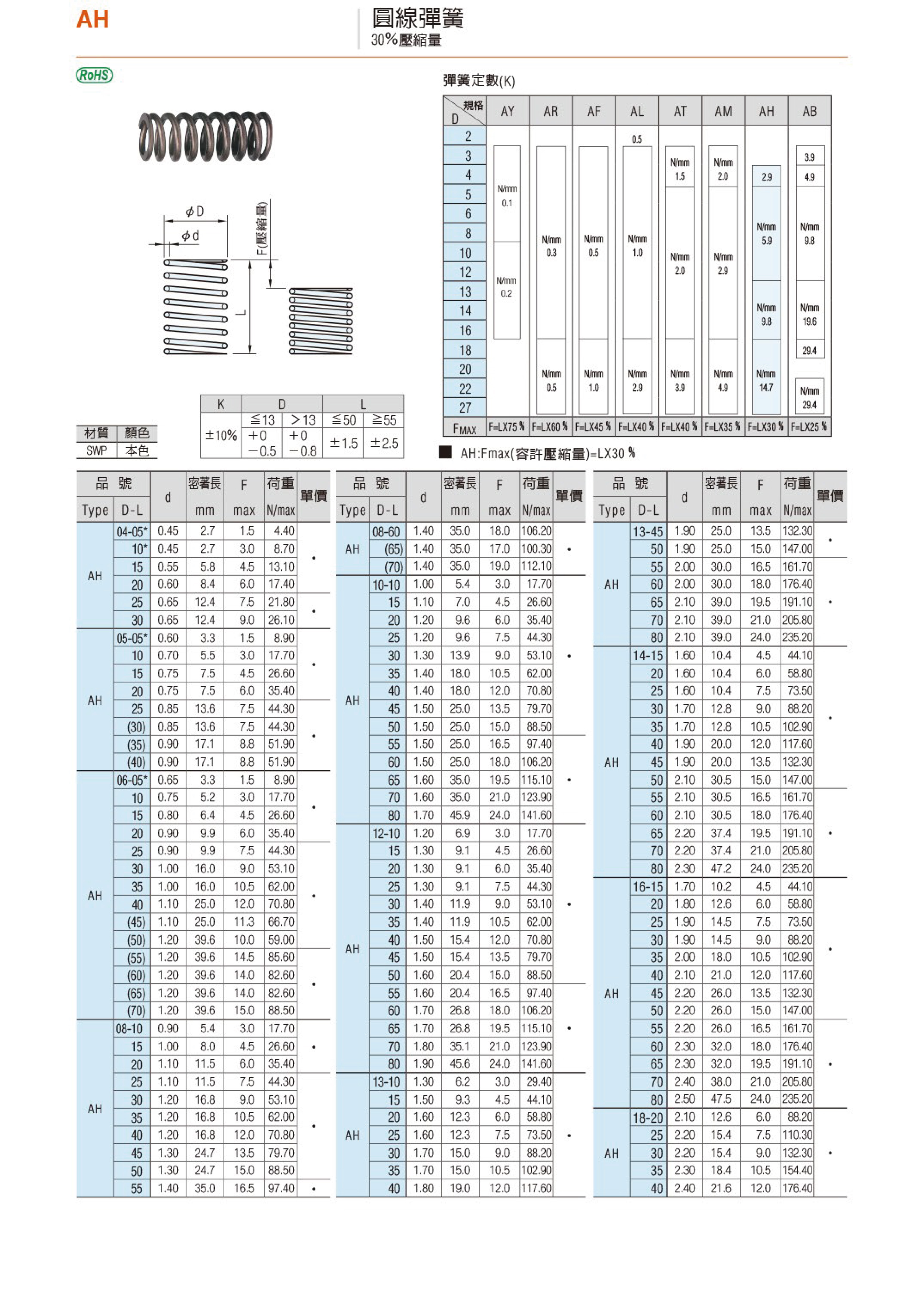 圓線彈簧(30%壓縮量)(外徑6) AH06-05 和更多型號