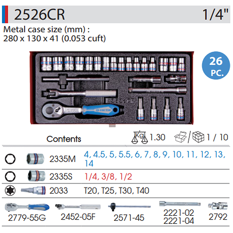 KING TONY金統立 1/4x26件6角套筒板手組 KT2526CR KT2526CR