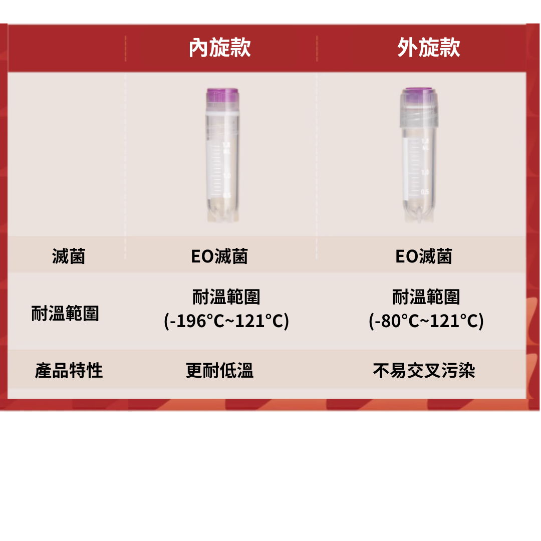 | 2mL 內旋紫蓋 | EO 滅菌 | 11 | 48 | 12 | -196°C ~ 121°C |