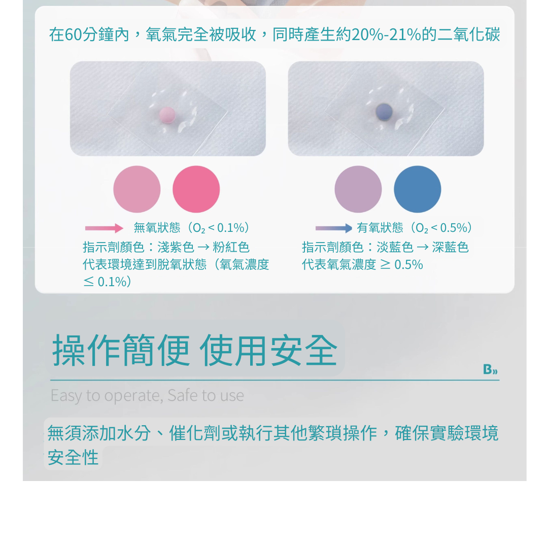 產氣 60 分鐘內可完全吸收氧氣,並產生約 20%–21% 的二氧化碳。
