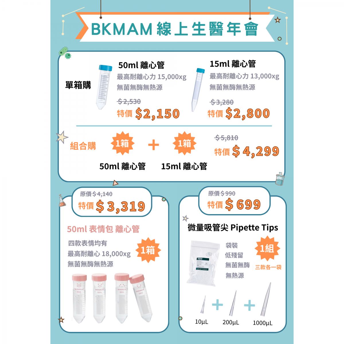 BKMAM 【線上生醫年會】15&50ml離心管 10&200&1000ul 微量吸管尖 限時優惠 110201031+110201289+110201007 和更多型號