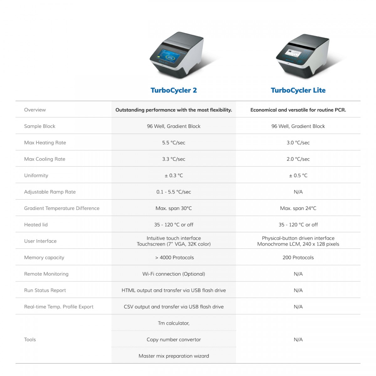 | Portability of Protocols | Save and transfer to computer or TurboCycler 2 via USB flash drive |