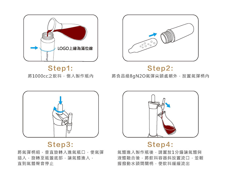 ◆可將食用級氮氣(N2O)或二氧化碳(CO2)與飲品混合產生驚奇口感