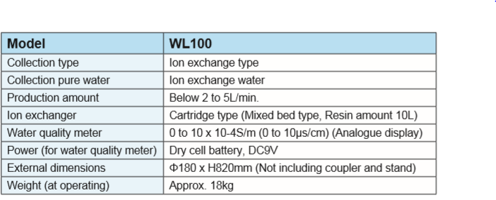 Simply collectable large amount of ion exchange water only by connecting to tap water. Built-in voltage circuit in water quality meter can check water quality immediately. Polyethylene made cartridge for lesser contamination. No AC power is required, and economical price. Easy maintenance.